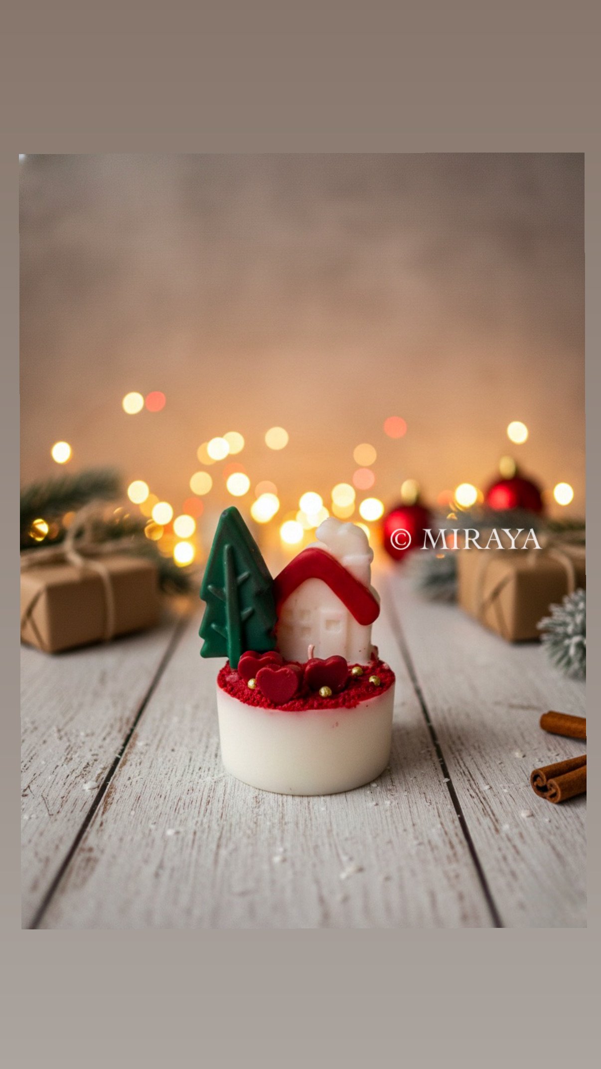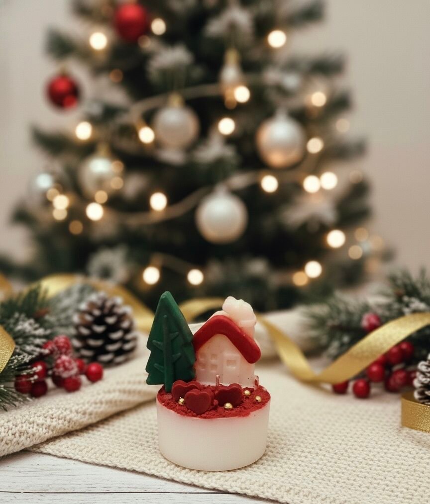 A small Christmas scene made with a lot of heart. This candle carries the feeling of a cosy winter evening — a tiny cottage, a tree, and little festive details. Perfect for gifting or bringing a gentle holiday warmth into your home.